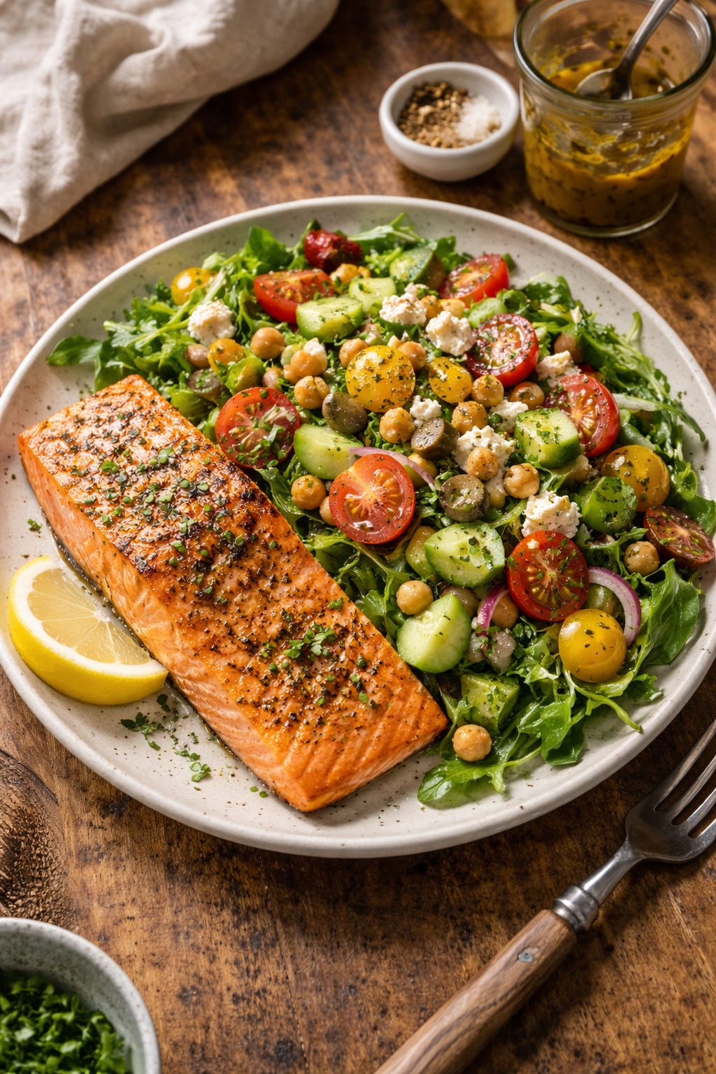 Salmon with a large salad including chickpeas. Protein: 37 grams total (25 from salmon, 12 from chickpeas). Fiber: 12+ grams from salad and chickpeas.